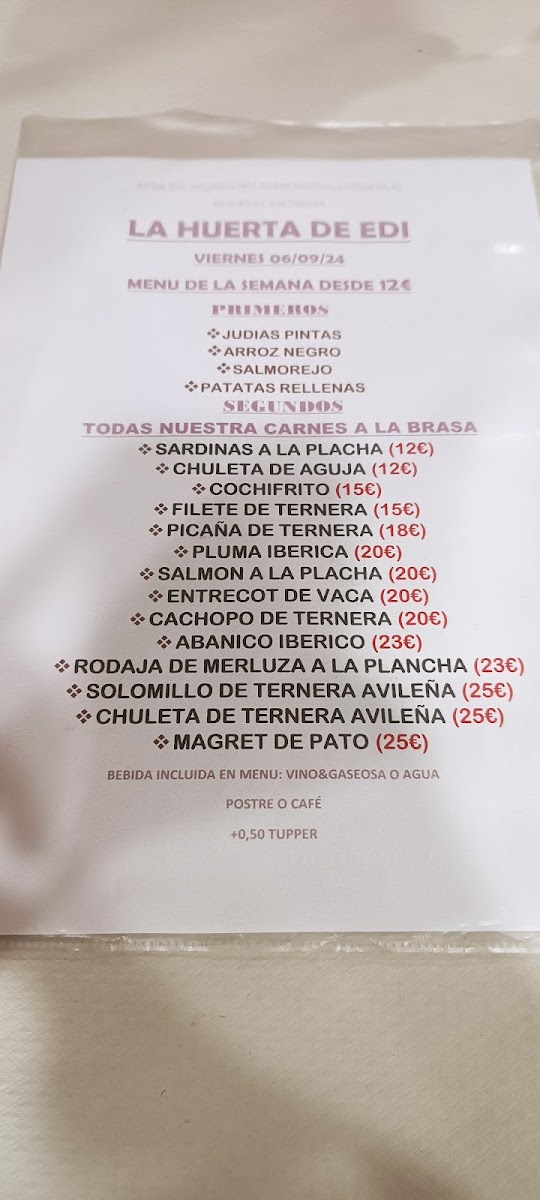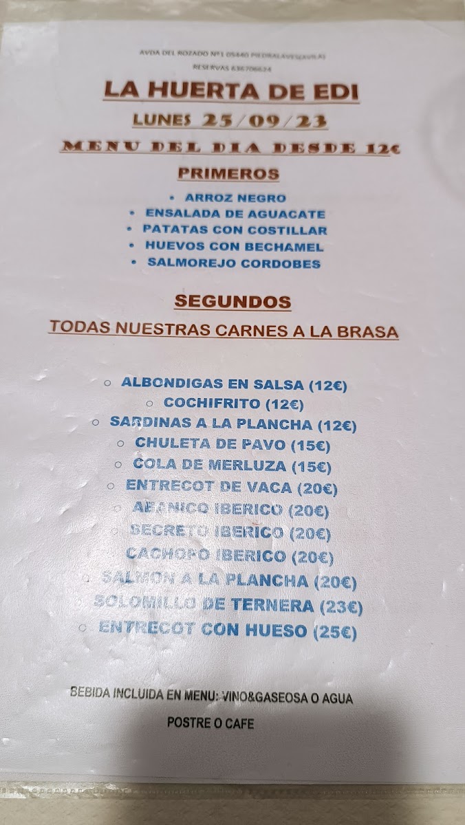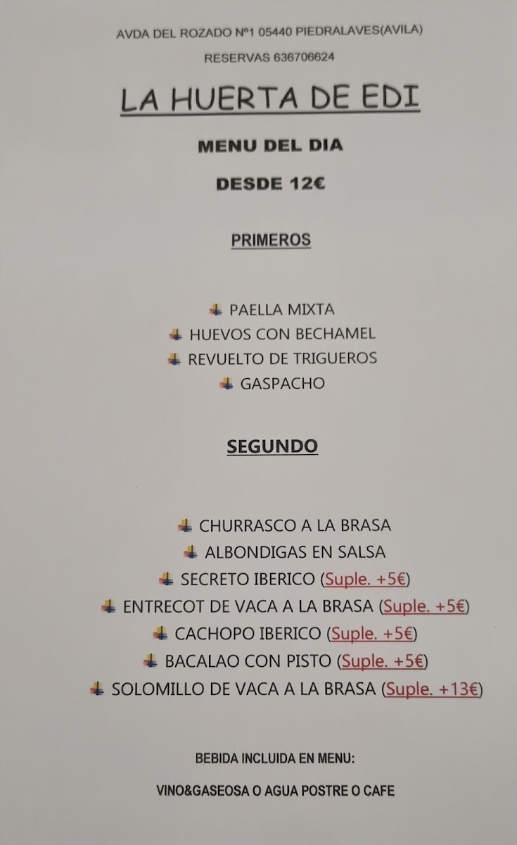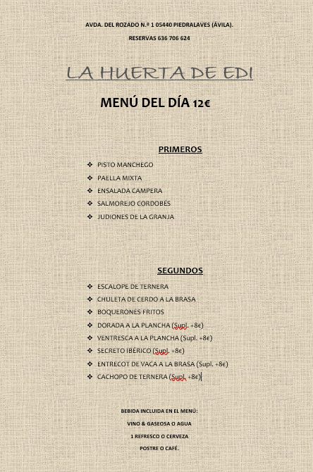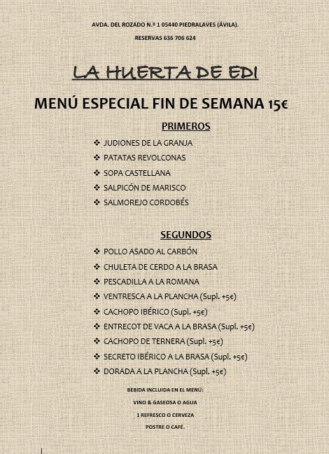 At Restaurante Cervecería La Huerta De Edi, located in the charming town of Piedralaves, Ávila, the menu offers a delightful variety of traditional Spanish dishes, perfect for every palate. From hearty meats to fresh, vibrant vegetables, each dish is crafted with care and full of rich flavors. The local ingredients shine through in every bite, making it a truly authentic experience. Whether you’re in the mood for a flavorful paella, a sizzling steak, or a refreshing salad, there’s something to satisfy your cravings. Pair your meal with a crisp local beer or a fine wine to complete your dining experience. The casual, welcoming atmosphere makes it a great spot for a laid-back meal with friends or family, while the carefully curated menu ensures that each visit offers something new to savor.